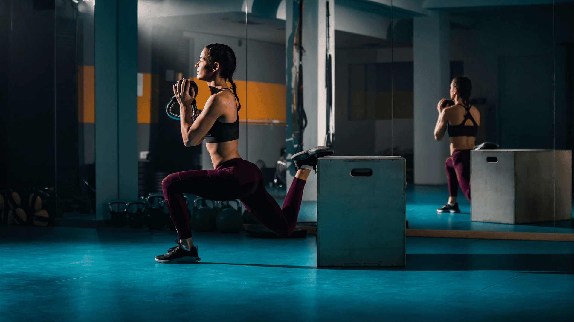 woman who leads an active lifestyle trains in the gym doing the Bulgarian squat